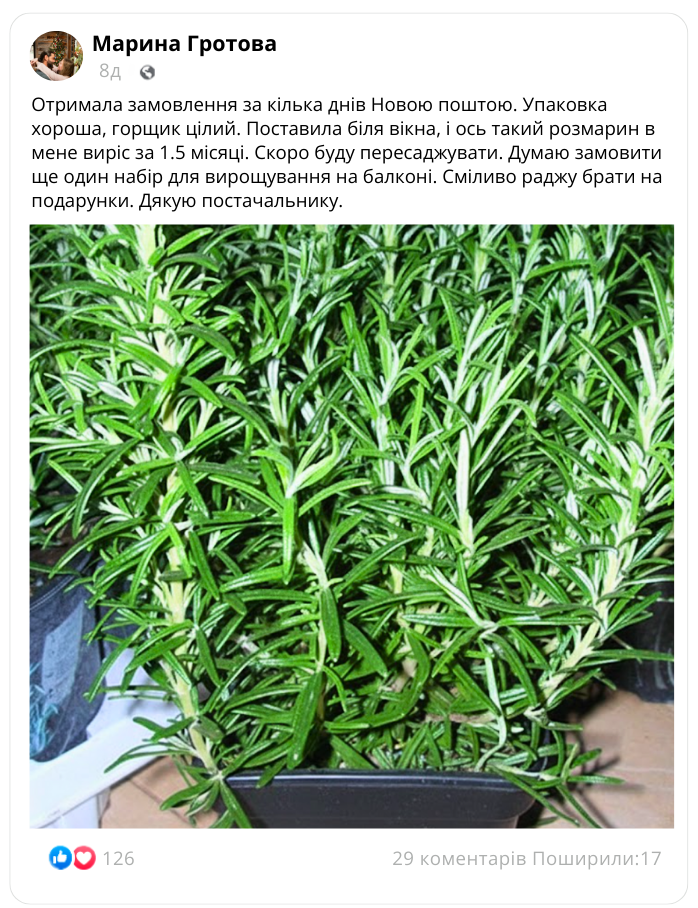 Ми доставляємо насіння насіння вічнозеленого розмарину у горщиках П9 за 2–4 дні Новою поштою  з оплатою при отриманні. Перед відправкою перевіряємо замовлення на відповідність сорту у три етапи, щоб ви отримали саме те, що обрали!